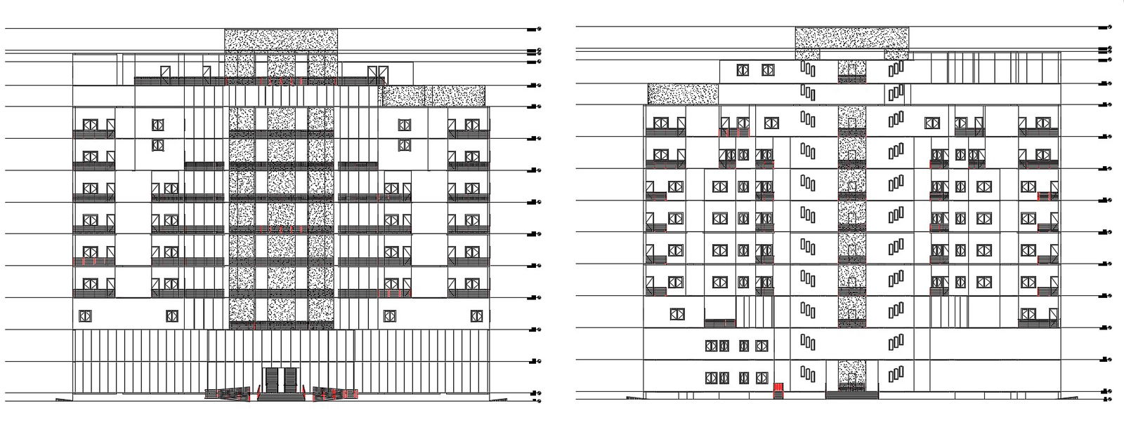 Residential apartment elevation drawing which shows multi-story apartment front elevation and side elevation details.