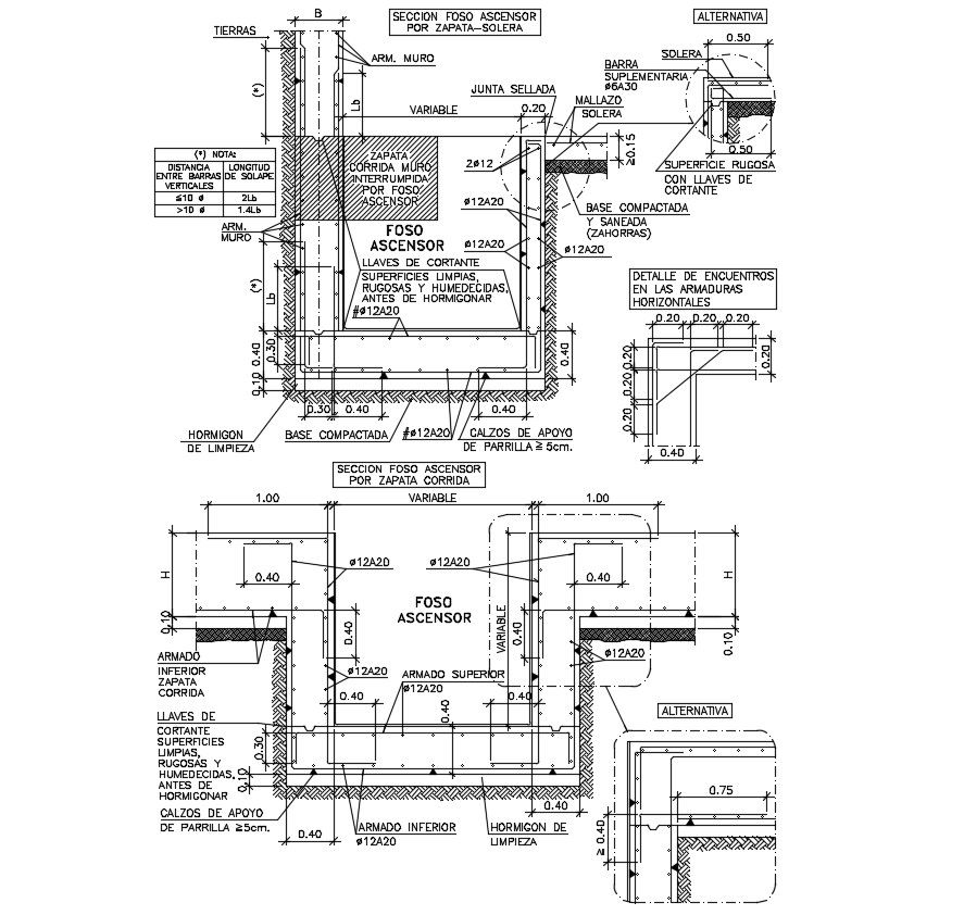Download reinforced concrete cement (RCC) structure detailing CAD drawing that shows reinforcement steel bars details along with bar dimension details, concrete masonry work details, and other structural blocks details.
