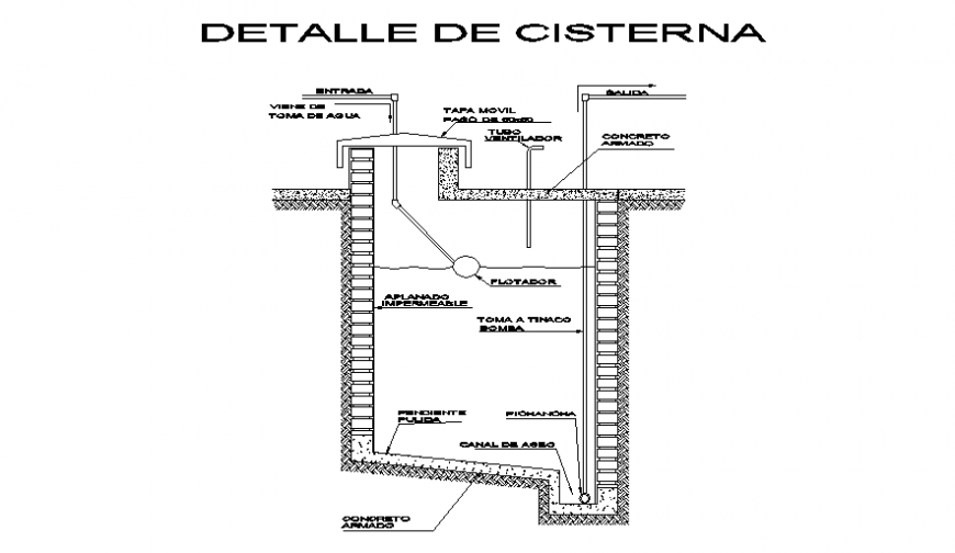 Detail cistern section plan autocad file, dimension detail, naming detail, brick wall detail, concrete mortar detail, water level detail, not to scale detail, pipe line detail, etc.