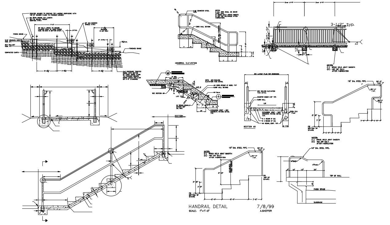 CAD drawing details of staircase construction which shows stairway riser and tread details along with concrete masonry details, reinforcement bars details, and the structure is a Reinforced concrete cement (RCC) structure.