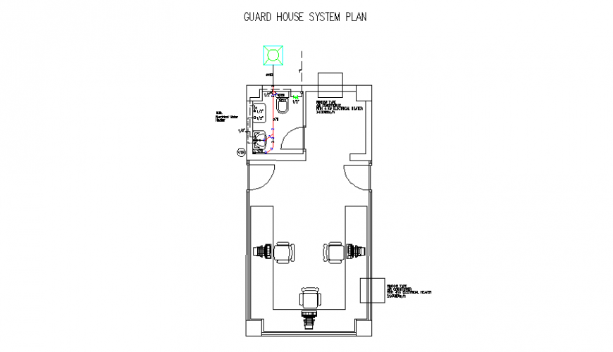 Guard house drawing file, hidden line plan detail, top elevation detail, column detail, furniture detail in door, table, chair and window detail, brick wall detail, flooring detail, not to scale detail, hatching detail, chamber detail, pipe line detail, etc.