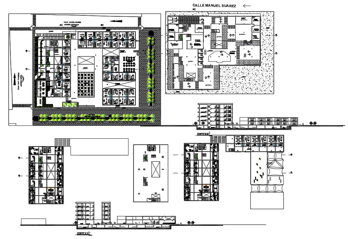 Download architectural design of shopping complex building plan elevation and section drawing which shows store and shop details, escalators and lifts details, sanitary toilet details, multi-purpose departments details, restaurant details, hotel details, and various other details,