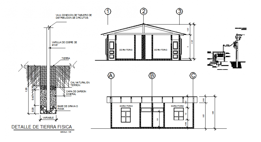 Detail of physical earth autocad file, centre line plan detail, dimension detail, front elevation detail, side elevation detail, furniture detail in door and window detail, scale 1:20 detail, stone detail, reinforcement detail, bolt nut detail, etc.
