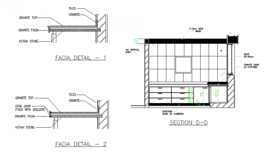Kitchen section plan autocad file, dimension detail, naming detail, section D-D’ detail, hatching detail, wall tiles detail, cub board and drawer detail, bearing detail, handle detail, concrete mortar detail, section A-A’ detail, section B-B’ detail, etc.
