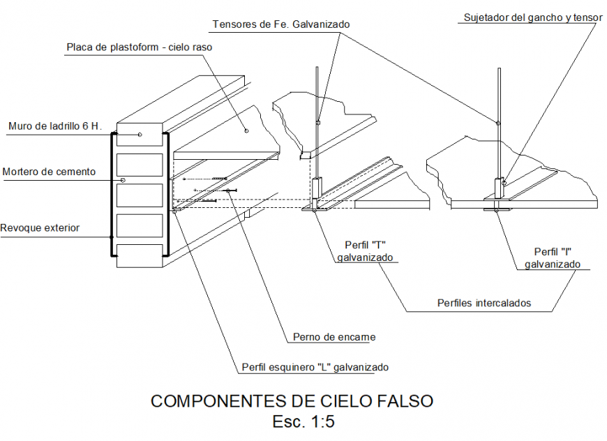 False sky components section autocad file, hidden line detail, scale 1:5 detail, naming detail, grid line detail, thickness detail, isometric view detail, concrete mortar detail, handle detail, bolt nut detail, hook section detail, etc.