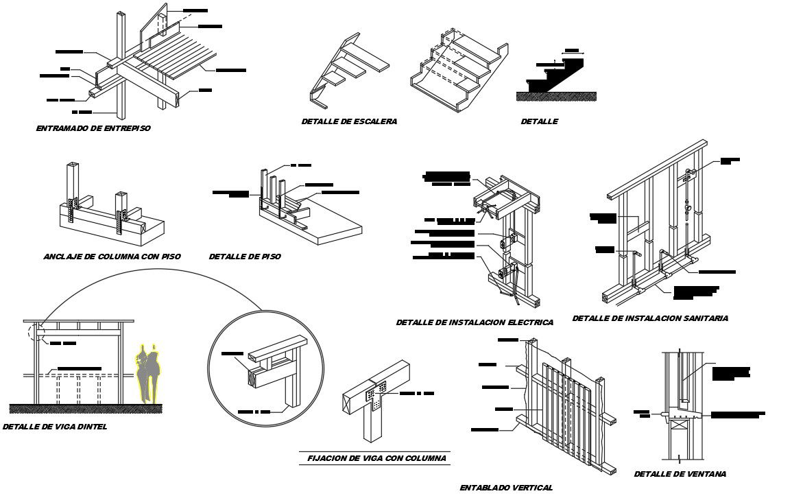 Wooden CAD Block for Design with AutoCAD File This include staircase,intermediate flooring, column anchor with floor, sanitary and electrical installation, vertical flooring, window, cad block for Drawing with autocad file