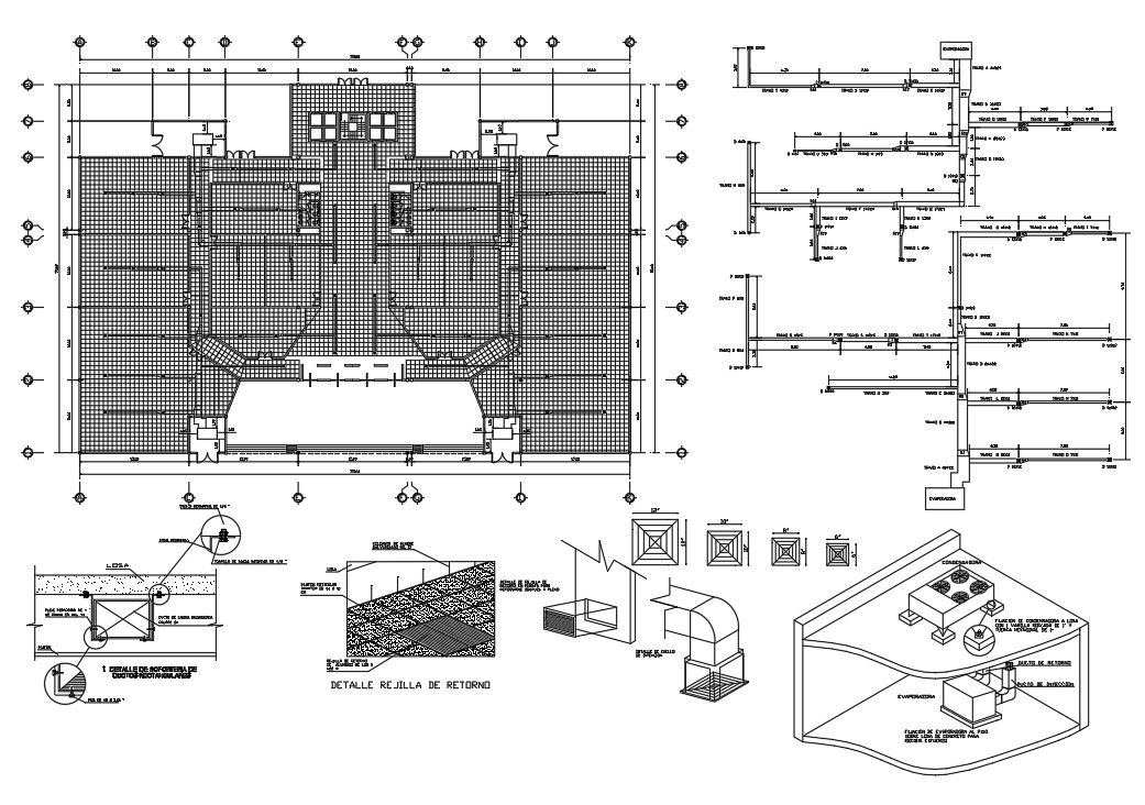 office A.C Duct roof plan and Faundession detail for DWG File this shows aluminum return grille,rectangular duct support, condensadora and evaporadora with download file, This A.C Lat-out Line Roof Plan for Drawing for DWG File