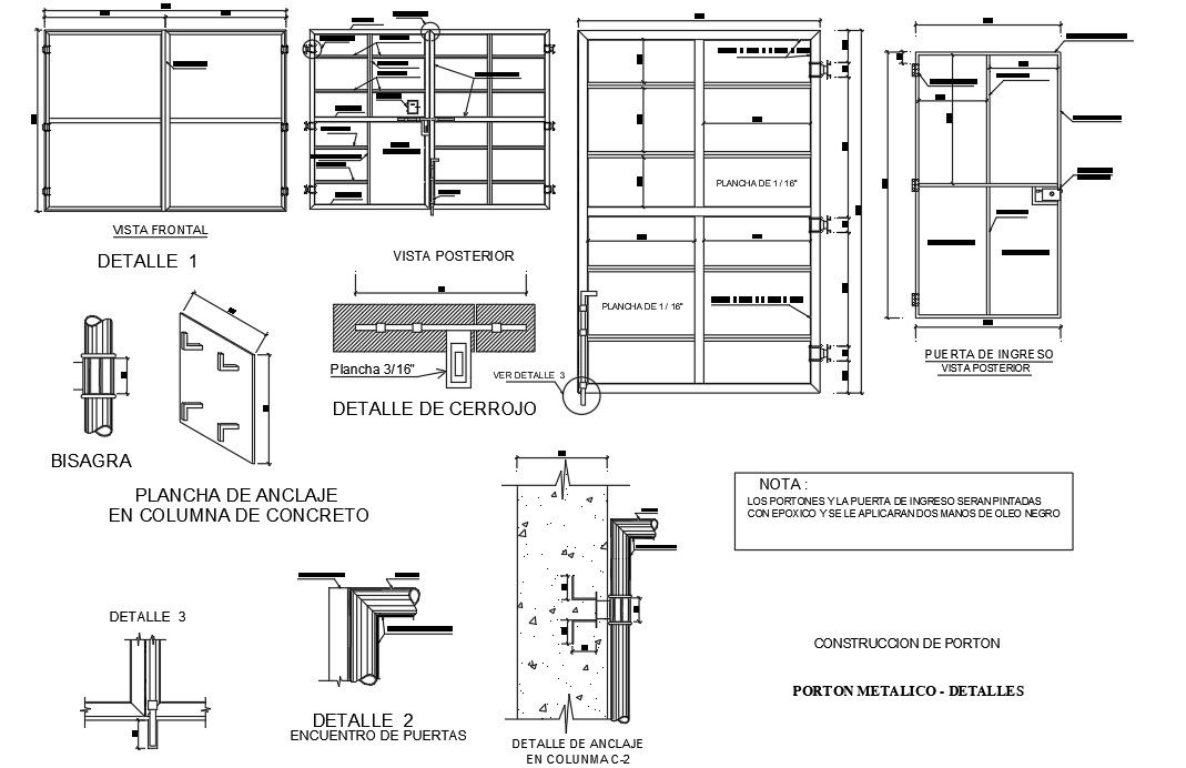 Metallic Gate Design CAD Block With DWG File.the gates and the entrance door will be painted with epoxic and two hands of black oil will be applied anchor plate in concrete column entry gate elevation with design for download file