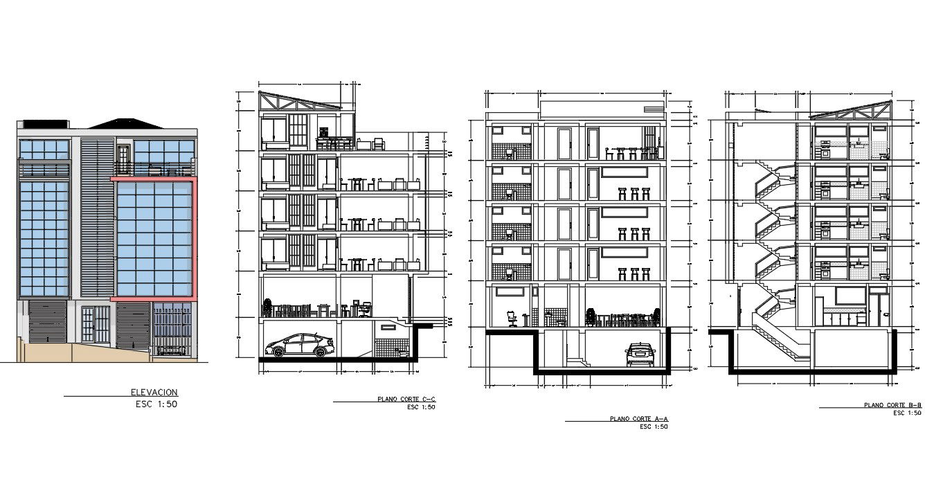Apartment House Elevation with section drawing for AutoCAD File.this shows Apartment house floor elevation design, layout, and 2BHK house 5 floor Apartment House and Furniture Design for download file