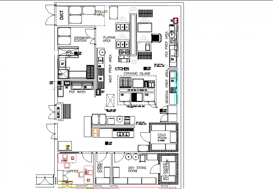 kitchen interior design lay-out, line of cooker hood over, new low wall at 1600mm affl, veg prep area, meat prep area, etc