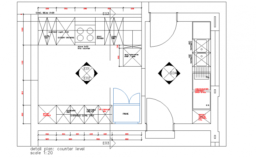 Detail plan counter level Design Download DWG file, overhead cupb. over, tip forward bin, vegetable shelves, etc.