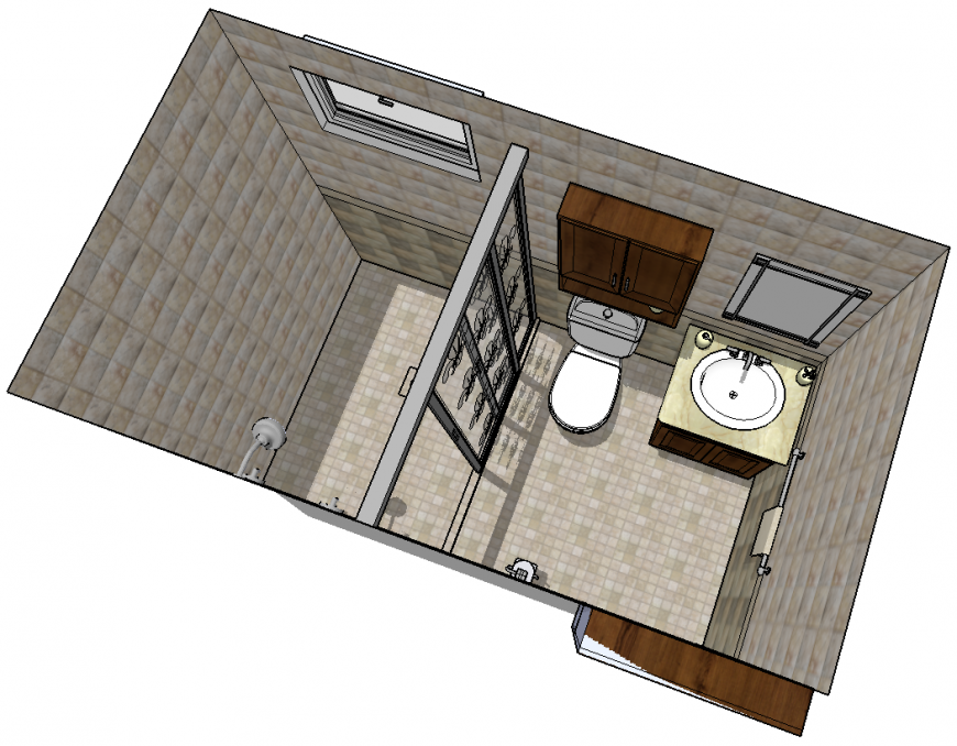 3D bathroom plan detail dwg file. The top view plan with detailing of commode, wash-basin, flooring, door, window, dimensions, etc., The elevation plan of bathroom with detailing of wall tiles, elevation of commode, wash basin, etc., with dimension detailing.