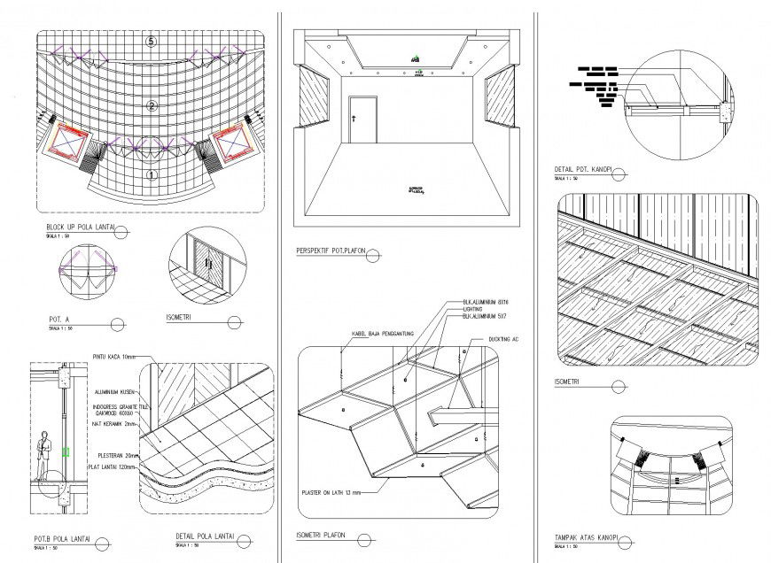 Isometric roof plan detail dwg file, ceiling design detail, scale 1:50 detail, dimension detail, naming detail, concrete mortar detail, hidden line detail, slab detail, window section detail, furniture detail in door and window detail, flooring tiles detail, cut out detail, leveling detail, etc.
