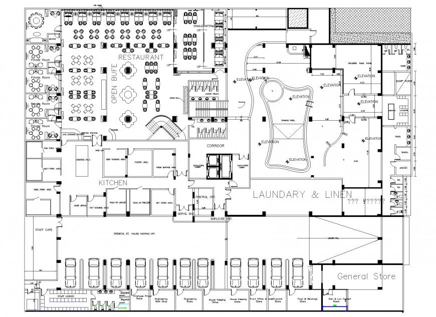 Basement restaurant planning detail dwg file, car parking detail, leveling detail, dimension detail, naming detail, concrete mortar detail, hathcign detail, toilet detail in water closed and sink detail, furniture detail in door, window, sofa, table, chair, cub board and drawer detail, stair detail, lift detail, cut out detail, etc.