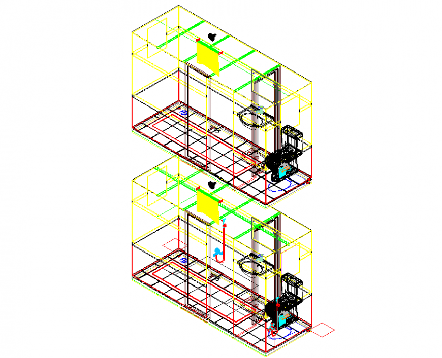 Toilet plan detail dwg file. The isometric view plan with detailing of toilet sanitary wares, commodes, wash-basin, partitions, door, floor tiles, etc.,