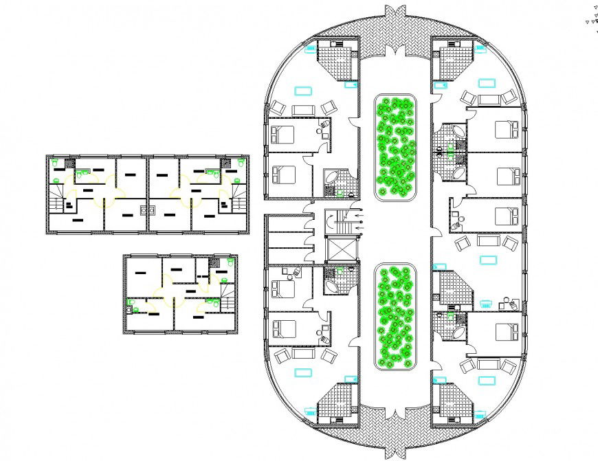 Hostel planning autocad file, landscaping detail in tree and plant detail, furniture detail in door, window, bed, sofa, table and chair detail, toilet tiles flooring detail, cut out detail, stair detail, toilet detail in water closed and sink detail, hatching detail, brick wall detail, etc.