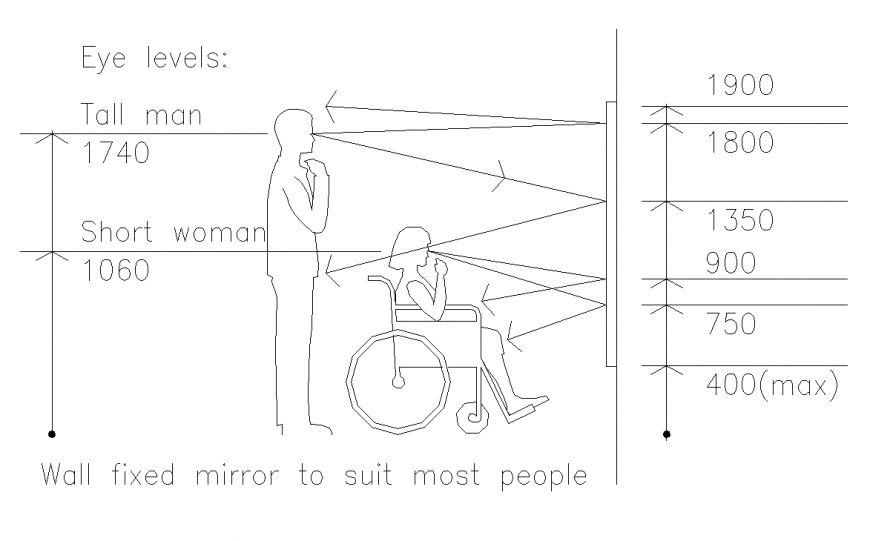 Different people 2d view layout file, men and women detail, wheel chair detail, wall fixed mirror detail, dimensions detail, side elevation detail, line drawing detail, eyes level detail, not to scale drawing detail, etc.
