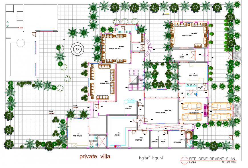 Villa plan detail dwg file.The plan of a house with detailing of furniture’s of bed, side tables, sofa, center table, flooring, car parkings, etc.,