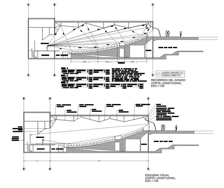 A Theater section plan layout file, centre line plan detail, legend detail, scale 1:125 detail, hatching detail, furniture detail in door and chair detail, dimension detail, naming detail, stair detail, specification detail, steel framing detail, etc.