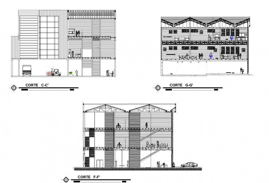 Section show room plan autocad file, section C-C’ detail, section F-F’ detail, section G-G’ detail, scale 1:200 detail, furniture detail in door, window, table and chair detail, car parking detail, hatching detail, steel framing detail, stair detail, etc.