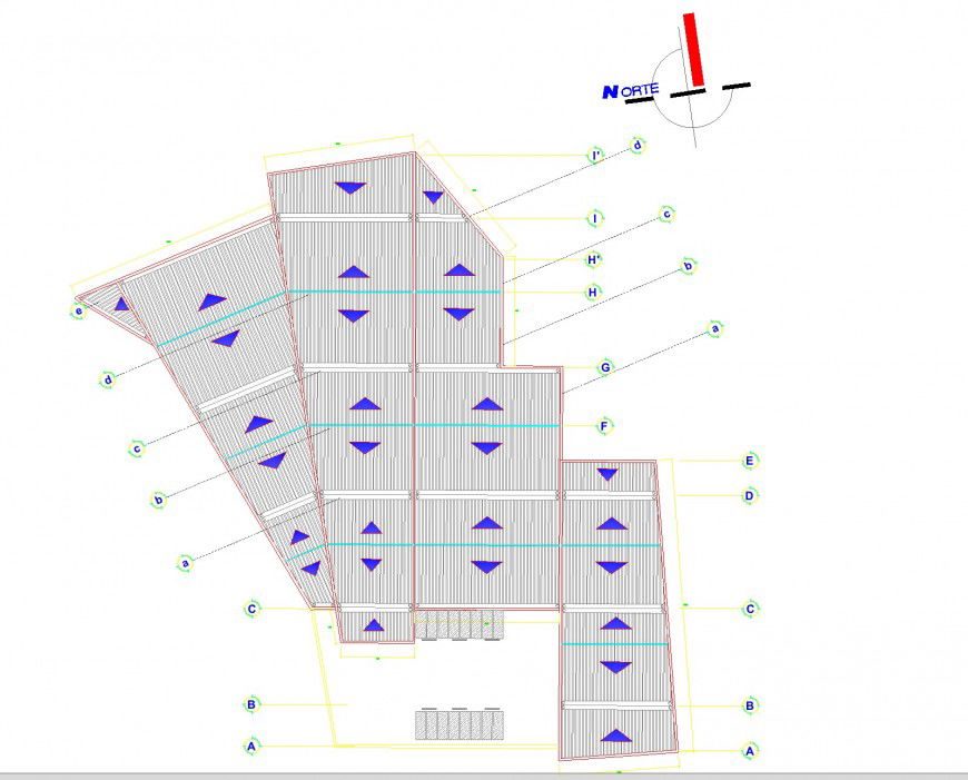Show room roof plan autocad file, centre lien plan detail, hatching detail, north direction detail, concrete mortar detail, arrow detail, dimension detail, naming detail, reinforcement detail, nut bolt detail, projection detail, etc.