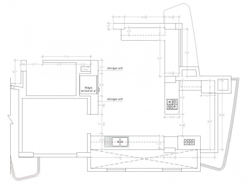 Small house planning AutoCAD file, dimension detail, naming detail, hidden lien detail, brick wall detail, flooring detail, furniture detail in door and window detail, kitchen detail in stove and sink detail, fridge detail, cut out detail, etc.