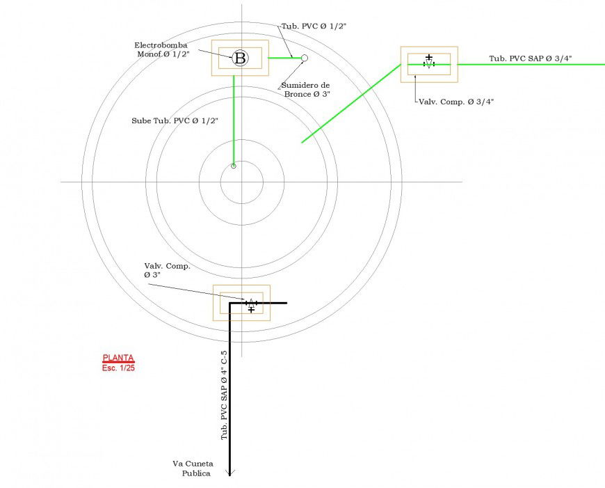 Square plan autocad file, dimension detail, naming detail, valve comp.detail, tables PVC sap detail, scale 1:25 detail, round shape plan detail, etc.