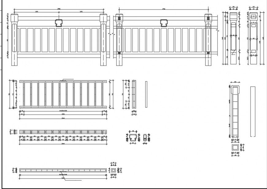 Bridge railing detail dwg file, dimension detail, naming detail, centre lien detail, plan and elevation detail, wooden material detail, different design of railing detail, grid lien detail, cut out detail, hatching detail, equal dimension detail, etc.