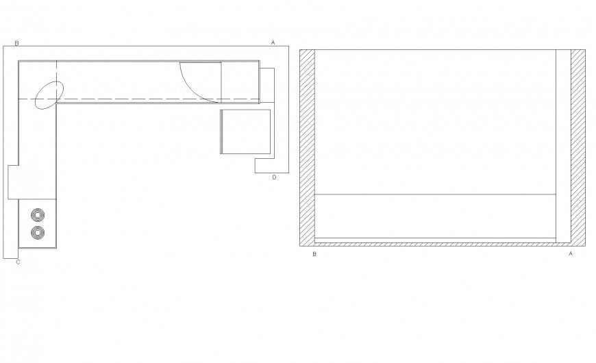 Kitchen line plan layout file, brick wall detail, hidden line detail, stove detail, sink detail, freege detail, oven detail, hatching detail, flooring detail, numbering detail, etc.