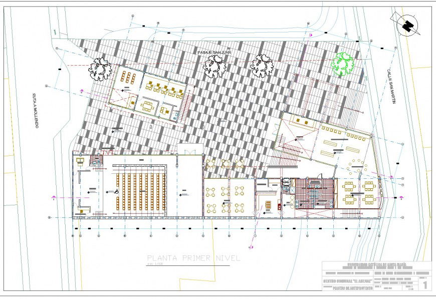 Planning restaurant autocad file, north direction detail, centre line detail, dimension detail, naming detail, hidden lien detail, furniture detail in table, chair, door and window detail, landscaping detail in tree and plant detail, brick wall detail, etc.