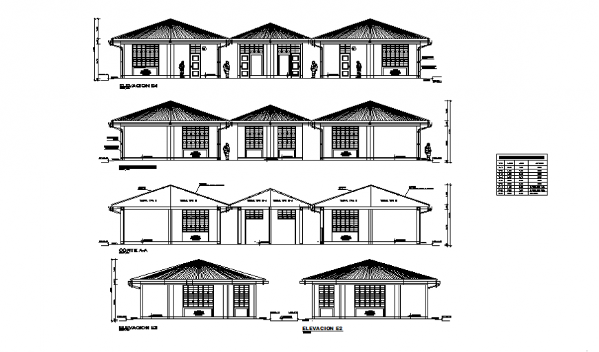 section of house , elevation of house , tabel of content , details of section A A' , elevaton E2 and E4 , dimension details of elevation of the house , dimension of door and windows , dimension of roofs , pattern of door and windows , leval of plinth , level of lintel , detail of guttter
