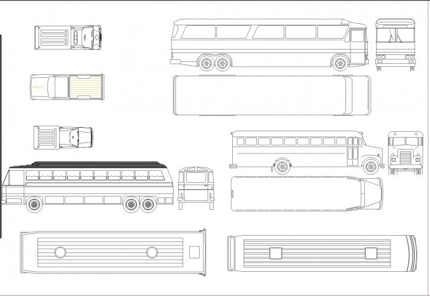 2d cad truck plan autocad file, top elevation detail, front elevation detail, side elevation detail, back elevation detail, wheel detail, mirror detail, hatching detail, etc.