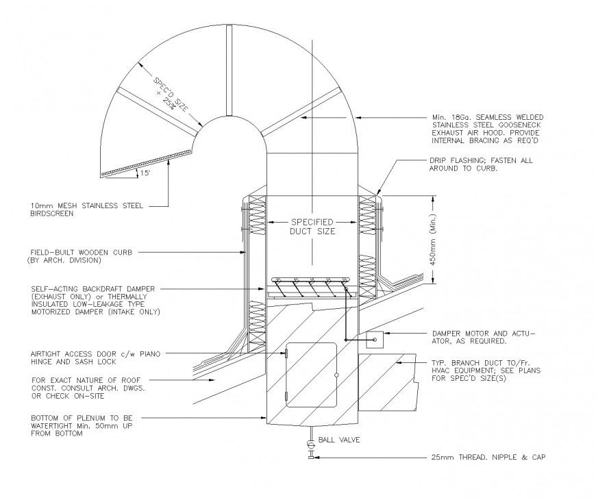 Gooseneck exhaust duct plan autocad file, dimension detail, naming detail, reinforcement detail, nut bolt detail, cut out detail, hatching detail, ball valve detail, 450mm reinforcement spring detail, arc shape of duct detail, not to scale detail, etc.