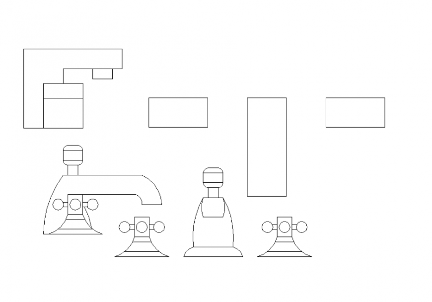 2 D tap plumbing design detail, front elevation detail, side elevation detail, different shape of tap detail, line plan detail, valve detail, handle detail, not to scale detail, stainless steel structural detail, main hole detail, different design detail, etc.