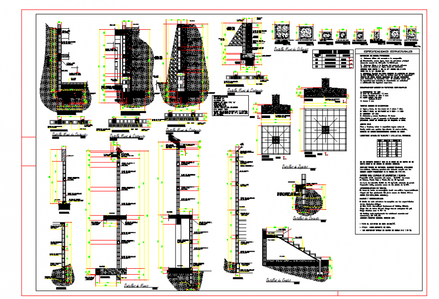 Foundation Construction Section detail Specifications: f'c = 3000 psi f '= 40000 psi sabieta de pega type "m" anchors 0.30 overlaps 0.40 fill all the holes with grout 1: 3: 2 block of 0.19x0.19x0.39 of 70 kg / cm. construction board from 1 "to 20.00 meters. in curtain.