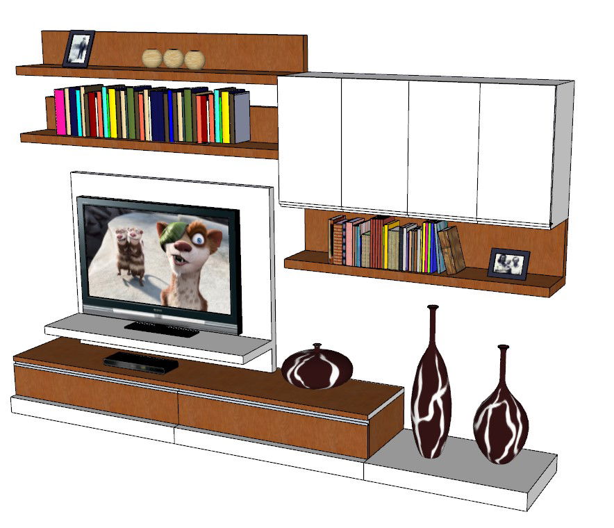 A 3d T.V unit design details in books dower, and table. A 3d T.V unit design draw in sketchup format. 3d T.V unit design download file, 3d T.V unit details