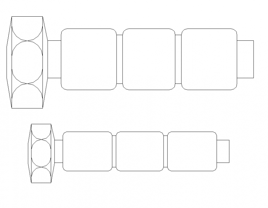 Nut bolt planning auotcad file, thread detail, nut head detail, iron detail, line drawing detail, not to scale detail, circle diameter detail, head and tail diameter detail, steel nut bolt detail, etc.