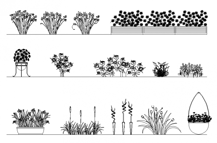 Plant elevation dwg file. Plants which are grown indoors. Different plants with their detailed plans and sizes etc.