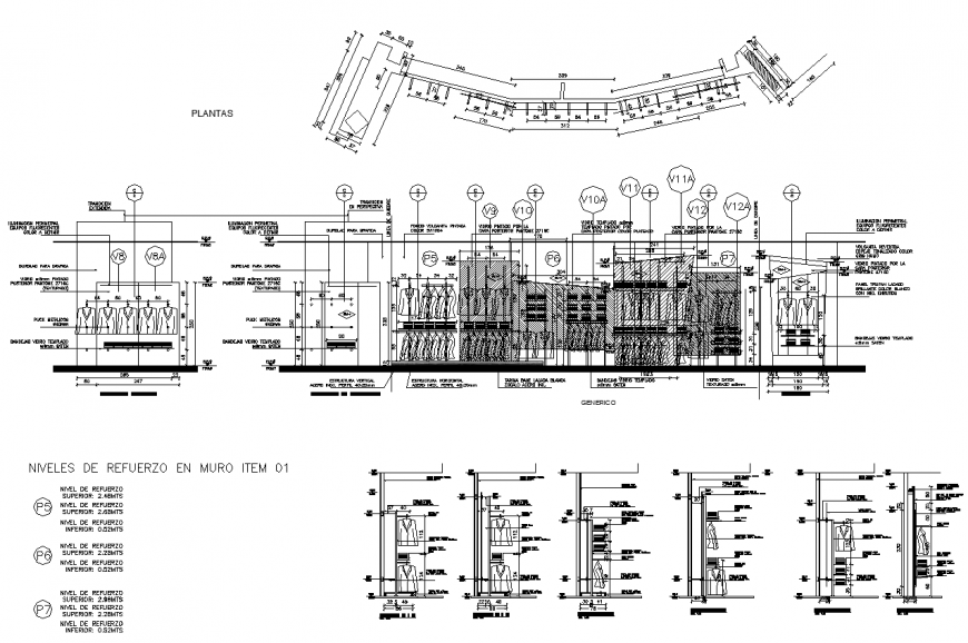 Garment showroom drawing in dwg file. top view plan of the display wall of the garment. Front elevation of the display wall for garment with detail text and dimensions. Section detail drawing of the wall with detail description and dimensions.
