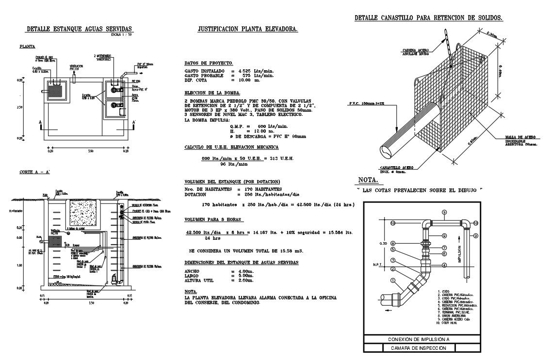 Storage tank Detail Design. Rationale Trunk Plant, Detail Pond Sewage, Dimention Od Pond Sewage, Piping PVC.Hidraulico . Storage tank Detail DWG File.