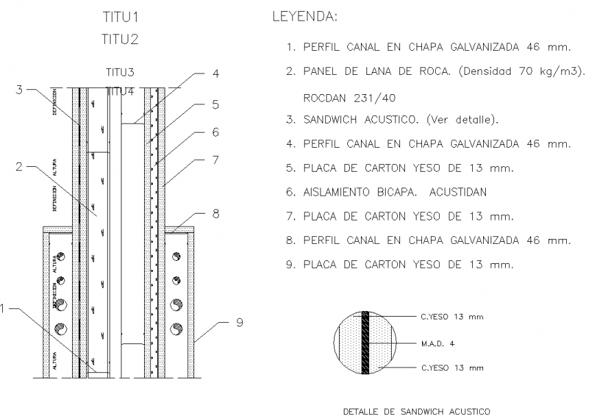 Plaster panels section plan autocad file, legend detail, numbering detail, concrete mortar detail, reinforcement plate detail, hidden lien detail, main hole detail, no to scale detail, perfil canal 46mm detail, etc.