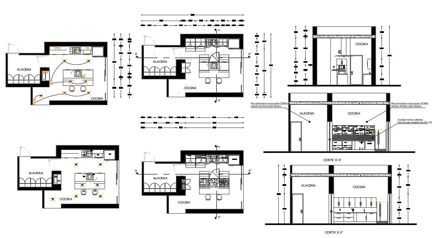 Kitchen Layout plan and Section With DWG File.This Shows Kitchen Layout plan and Section Acrylic Coating texture textured white Cemix, vinilica green paint marks comes ,Tile brand Corker,cube shape pistachio Kitchen design download file,