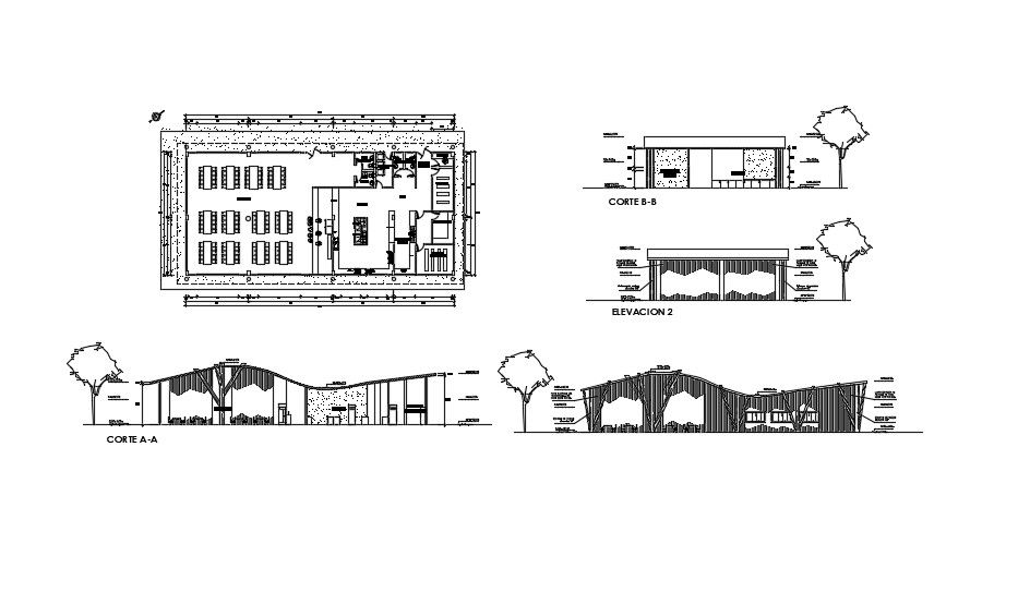 Restaurant Plan Elevation Section In AutoCAD File which includes the details of table design, chair, hall, elevation and section details.