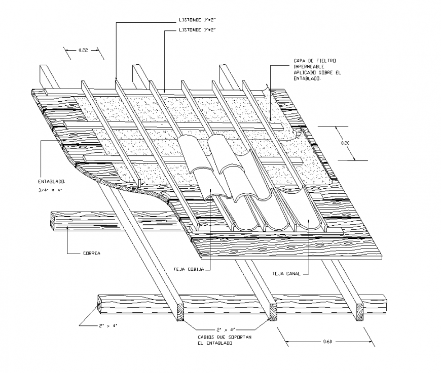 Tile Detail Colonial roof DWG file. with felt cover, raincoat, applied on the, decking., list where, decking., belt, white tile, roof tile, that support, etc.