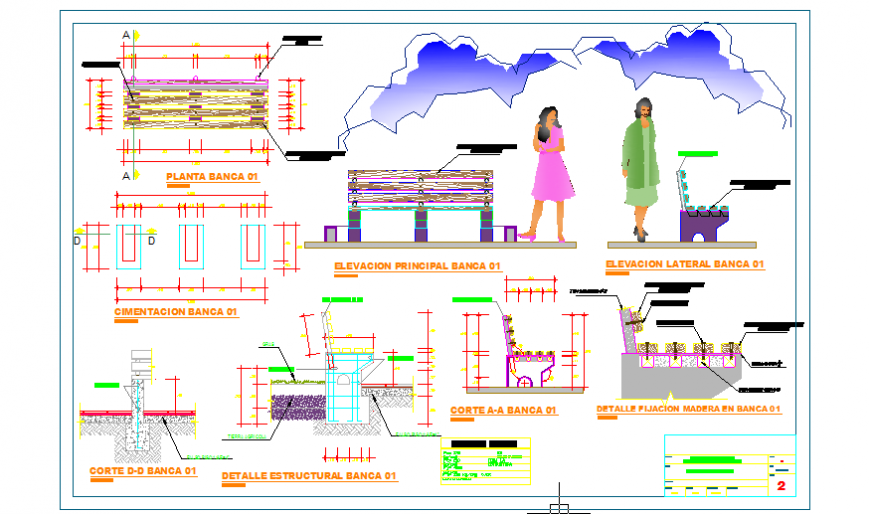 Here the Wooden bench detail section design drawing with Plan design, foundation design, elevation design, Section desing, Structure detail design, Side section design, detail section drawing of fixing wood in banches design drawing in this auto cad file.