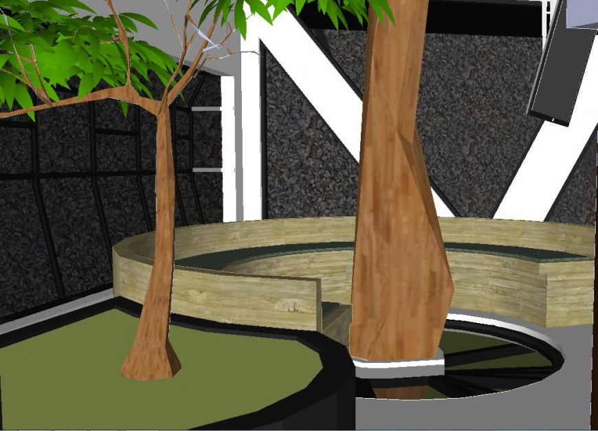 Circular seating view 3d concept model,here there is front view detail in 3d, circular seating detailing of house