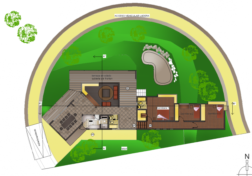 Mediterranean living planning autocad file, section line detail, north direction detail, landscaping detail in tree and plant detail, swimming pool detail, cut out detail, flooring tiles detail, stair detail, brick wall detail, furniture detail in door, window, table, chair, bed, sofa, cub board and drawer detail, etc.