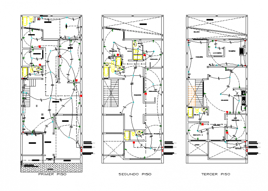 A Electrical house plan layout file, dimension detail, naming detail, cut out detail, brick wall detail, flooring detail, brick wall detail, flooring detail, toilet detail in sink, bathtub and water closed detail, hatching detail, hidden lien detail, column detail, not to scale detail, etc.