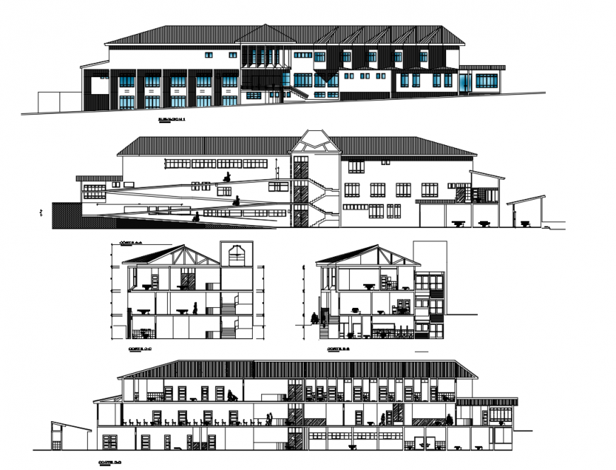 Health center elevation detail dwg file. Front elevation detail, section detail, sitting chair detail, door and Window detail, stair detail, heaching detail, roof detail, people detail etc in autocad format.