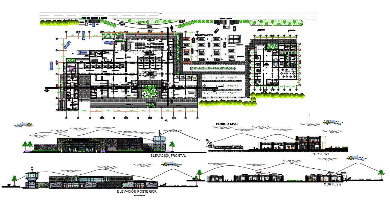 Airport Plan And Elevation With design For DWG File..this provide Include elevation plan , layout plan, section, Waiting Room, Main Hall, Boarding Room, Room Landing, Reference Level, Septum,super board,Thickness With Dimension Detail